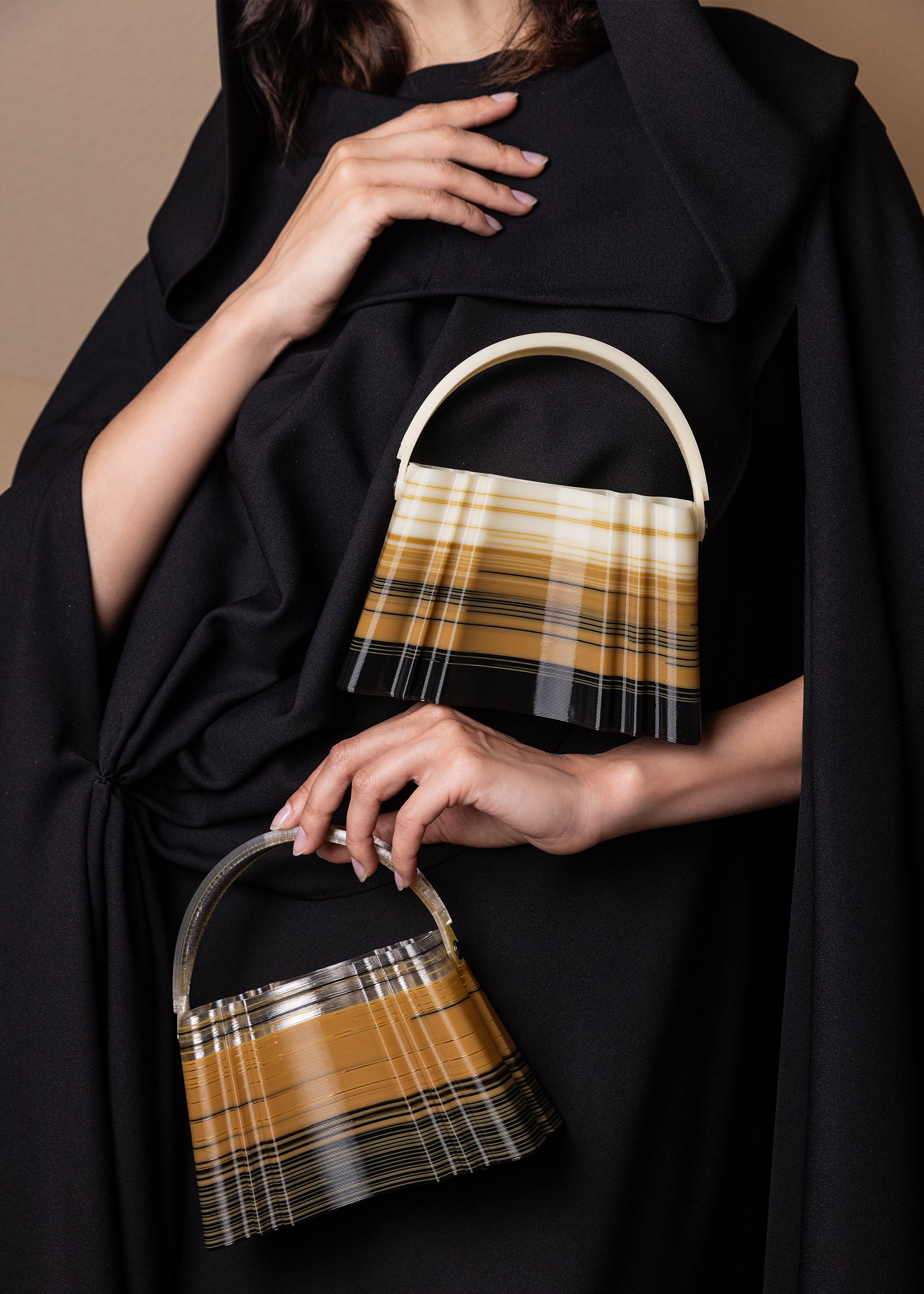 Channel the bold and mysterious atmosphere of the desert with our Desert Dune bag. This 3D printed piece is inspired by the warm earthy tones and expansive landscapes of the desert. Made from strips of color that blend seamlessly together, each bag is a unique creation, perfect for those who love neutrals and carry a spirit of adventure.
