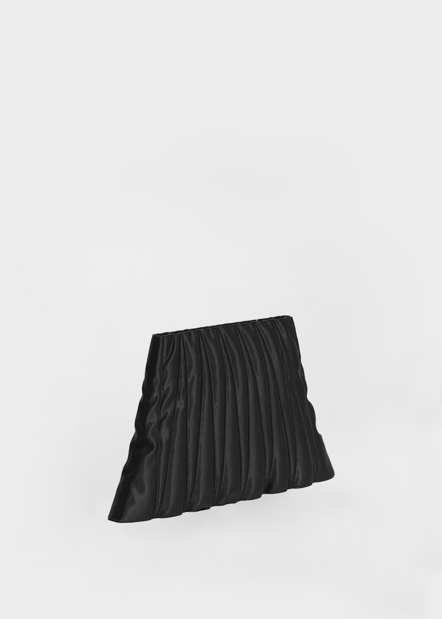 This piece features an exaggerated silhouette, making a bold statement with its compact, clutch-size shape. Its unique texture flows like soft, moving fabric, catching the light and creating a sense of depth.